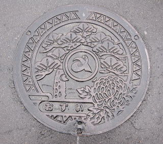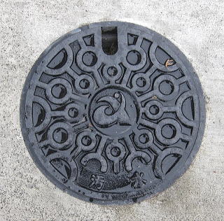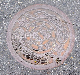 その 3 同心円状に ◎ を線で繋いだ黒色の背景 模様の中心に市章を配したデザイン 一般家庭と本管を繋ぐ蓋 撮影日; 2012年10月28日 撮影場所; 名鉄津島線 勝幡駅北口付近