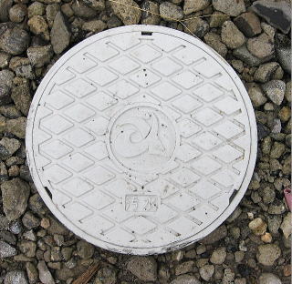 その 4 白地にひし形の格子背景模様の中心に 市章と識別文字を配したデザイン 一般家庭と本管を繋ぐ樹脂製の蓋 撮影日; 2012年10月28日 撮影場所; 名鉄尾西線 佐屋駅東口付近