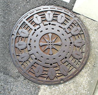 六角形の背景模様の中心に市章を配した