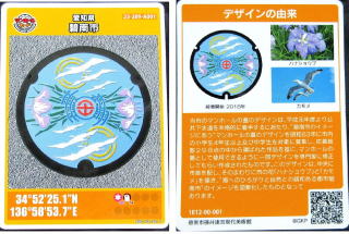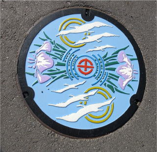 水色の背景に 中央に市章を 周りに 市の花;