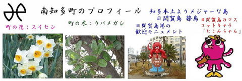 その 1 三河湾に浮かぶ 佐久島 篠島 日間賀島 の三河湾3島の内 最も観光客が多い 日間賀島は特産の 「フグ」 と 「タコ」 料理が有名 特産のフグが日の丸入りの扇子を持って 歓迎の様子を描き 下に町の花:スイセン と管理者名を配したデザイン 撮影日; 2007年1月31日 撮影場所; 南知多町 日間賀島 西港付近