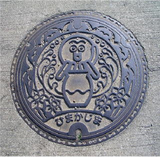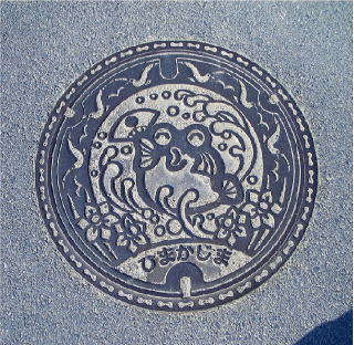 その 2 特産のタコがタコつぼに登り 歓迎している 様子を描き 下に町の花;スイセン と管理 者名を配したデザイン 撮影日; 2007年1月31日 撮影場所; 南知多町 日間賀島 西港付近