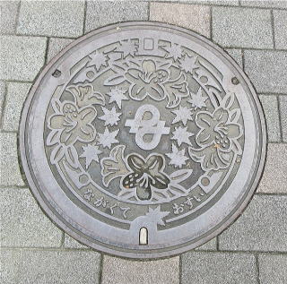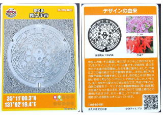 その 2 蓋全体に市の花;サツキ を 上に市の木;カ エデの葉を描き 中心に市章を下に管理者名 と識別文字を配したデザイン 撮影日; 2017年1月13日 撮影場所; 長久手市 文化の家 付近 県道215号沿い
