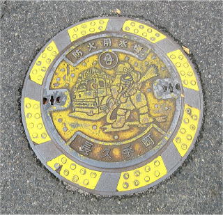 その 3 中心に消防車と放水する消防士を描き 上に 識別文字「防火用水槽」と市章を 下に管理 者名「長久手町」を配したデザイン 撮影日; 2017年1月13日 撮影場所; 長久手市 文化の家 付近 県道215号沿い