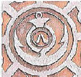 〇印を配した背景模様の中心に不明のロゴ