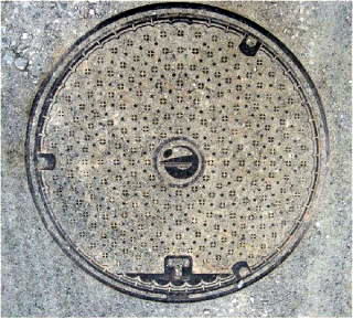 その 2 ● と ■ を交互にリング状に配した背 景模様の中心に町章を下に識別文字 「おすい」 を描いたデザイン 一般家庭 と本管を繋ぐマンホール蓋 撮影日; 2007年1月24日 撮影場所; 伊方町役場付近の 民家の路地