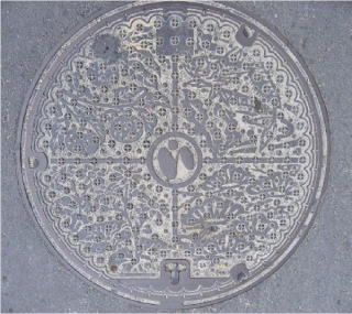 その 1 中心に旧伊方町の町章を 周りに町の 町の特産品 「ミカン」 町の魚 「ハナアジ」 そして町の花; ツワブキ と 町の木; マツ を描いたデザイン 滑り止めの突起を配 して有るので見ずらい 撮影日; 2007年1月24日 撮影場所; 伊方町役場付近