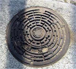 その 1 工の字型のリング状の背景模様の 中心に旧の村章?(頭に目がついた カエルか?) と識別文字「汚水」を 配したデザイン 撮影日; 2006年3月15日 撮影場所; 島の玄関口 魚島港の 民家の路地