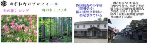 その 1 四国最古の小学校で国指定重要文化財 に 「旧開明学校校舎」 と町の花; レンゲ を描いたデザインのカラー版 撮影日; 2009年5月10日 撮影場所; 日本の重要伝統的建造物群 保存地区に指定されている「宇和 文化の里」 宇和町卯之町