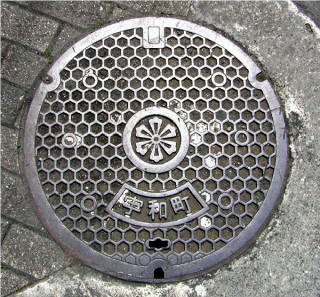 その 3 六角形の背景模様の中心に旧宇和町の 町章と管理者名 「宇和町」 を配したデザ イン 撮影日; 2009年5月10日 撮影場所; 日本の重要伝統的建造物群 保存地区に指定されている「宇和 文化の里」 宇和町卯之町