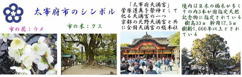 その 2 梅の小枝に花咲く背景模様の中心に 梅の花をデザイン化した市章を配した デザイン 天満宮の神紋も梅の花です また「飛梅 (トビウメ)」伝説があり 太宰府に流された 道真が詠んだと云われる和歌が有名 「東風吹かば にほいをこせよ 梅花(ウメノ ハナ) 主(アルジ)なしとて 春を忘るな」 撮影日; 2008年7月5日 撮影場所; 太宰府天満宮 の参道