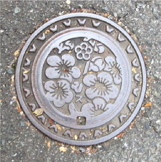 その 3 蓋全体に 市の花;ウメ を描いたデザイン に 周りの受枠に V 字模様を配したデザ イン 一般家庭と本管を繋ぐマンホール蓋 撮影日; 2008年7月5日 撮影場所; 太宰府天満宮 の参道