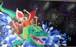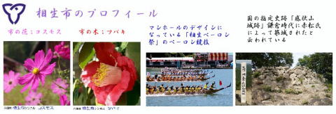 その 1 ピンク色の背景模様に毎年五月末の日曜日 に開催される「相生ペーロン祭」 の 「ペーロン 競漕」 の熱い漕ぎ手と 市の花;コスモス を 描いたデザイン 撮影日; 2013年4月4日 撮影場所; JR山陽線 相生駅南口広場 駅前通り |