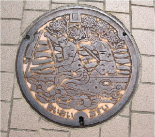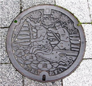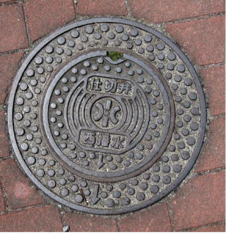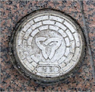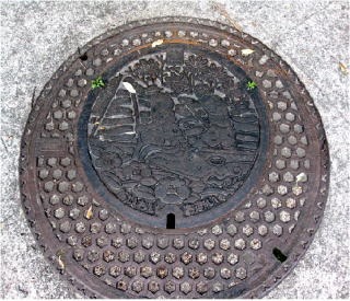 その 3 六角形の背景模様に その 2 と同じデザイン を貼り付けた親子蓋 撮影日; 2013年4月4日 撮影場所; JR山陽線 相生駅南口広場 駅前通り |