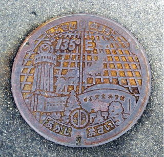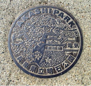 その 8 日本の城 百名城の一つ 「明石城跡」の 西南の隅に建つ国の重要文化財 「ひつじ さる櫓」 と 桜 (城内の桜は日本の桜 百選)を描いたデザイン 電気施設のマンホール蓋で ここ城内に しか存在しない 撮影日; 2015年7月28日 撮影場所; JR明石駅北口 明石公園内 |
