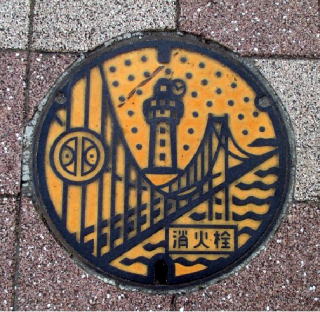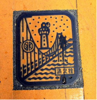 その 11 オレンジ色の背景に「天文科学館の 時計塔」 と 「明石海峡大橋」 を描いた デザインの消火栓の蓋 撮影日; 2015年7月28日 撮影場所; JR明石駅南口 国道2号沿い |