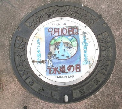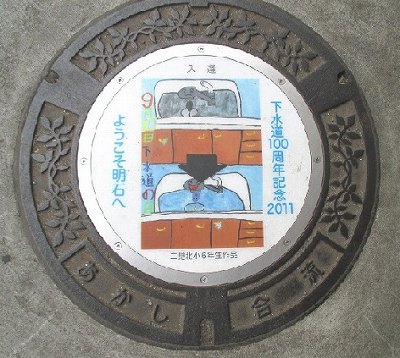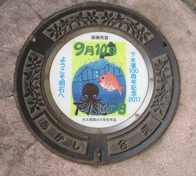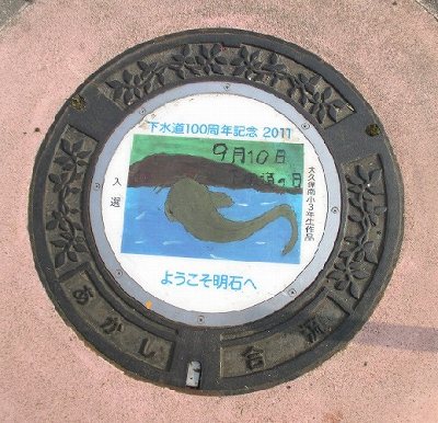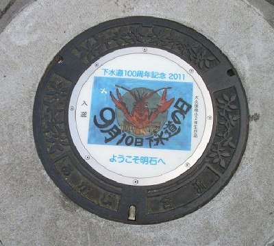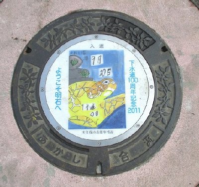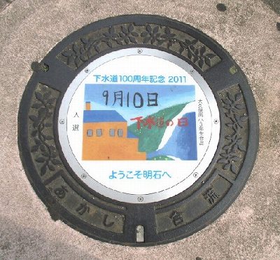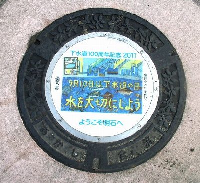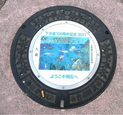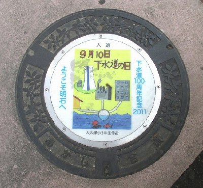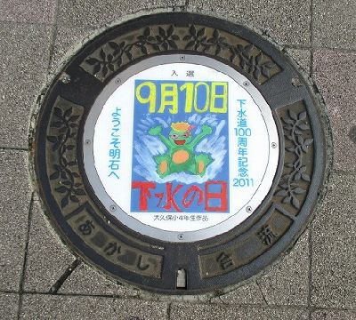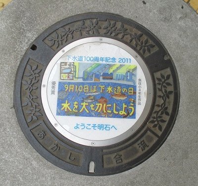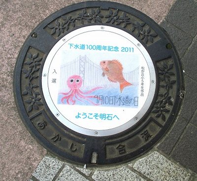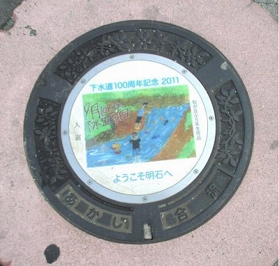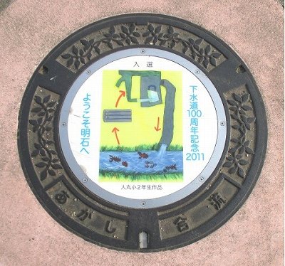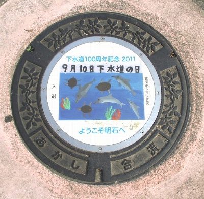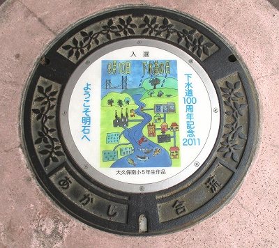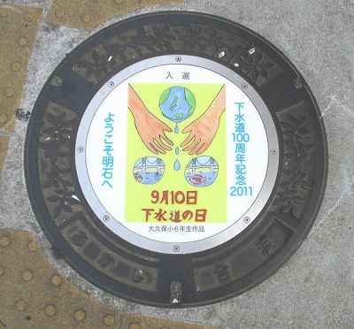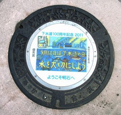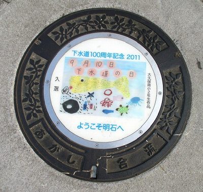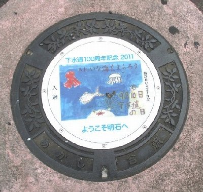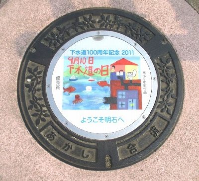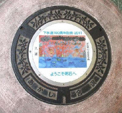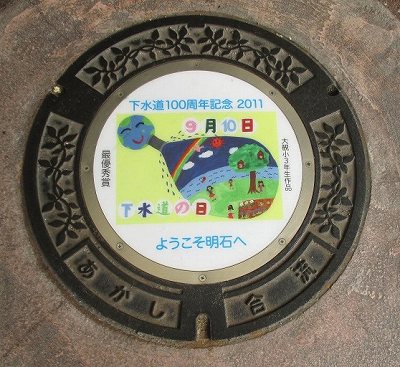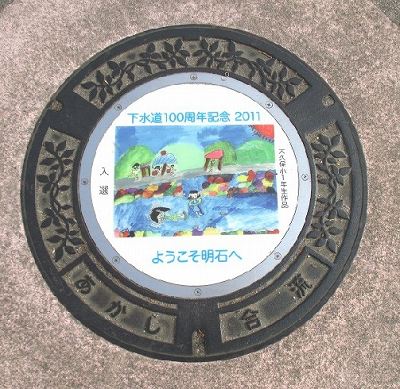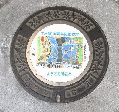 明石市下水道 「100周年記念デザインマンホール蓋」 下水道建造認可を取得してから、 2011年に100年を迎えた 記念して 2011年9月に市の「下水道展の絵画応募作品」から 28点をデザインマンホール蓋の図案として採用 撮影日; 2015年7月28日 撮影場所;JR明石駅南口広場 国道2号線沿いの歩道