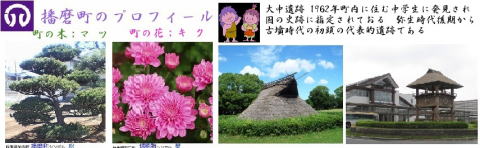 その 1 弥生時代後期から古墳時代にかけての 代表的な遺跡 「大中遺跡」 (国の史跡 指定 )と 町の花;キクを描いたデザイン 撮影日; 2015年7月28日 撮影場所; JR山陽線 土山駅 南口広場付近 |