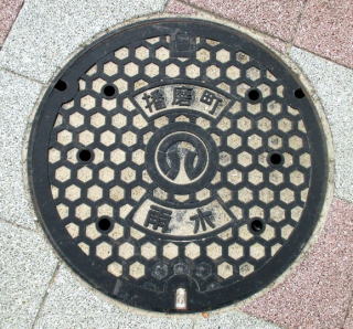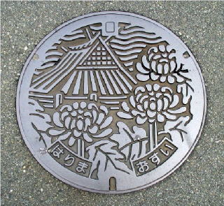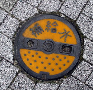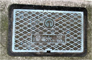 その 3 長方形の同心円型の背景模様の中心 に市章と識別文字を配したデザイン 一般家庭と本管を繋ぐ樹脂製のマン ホール蓋 撮影日; 2015年7月28日 撮影場所; JR山陽線 土山駅 南口広場付近 |