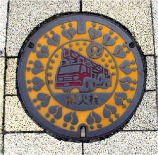 その 6 中心に消防車と町章を周りに町のシン ボルマークを配した消火栓の蓋 シンボルマーク 撮影日; 2015年7月28日 撮影場所; JR山陽線 土山駅 南口広場付近 |