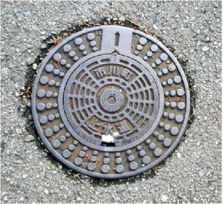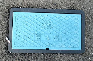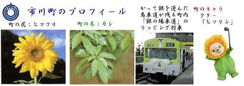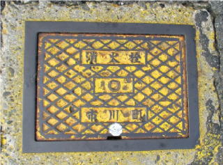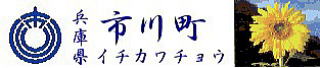 その 1 中心に 町の花;ヒマワリ を描き 上に「市川町」 下に 「水道」 の文字を配した水道栓 撮影日; 2015年7月29日 撮影場所; 姫新線 甘地駅前 県道407号沿い