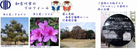 その 2 黒色の背景模様にその 1 と 同じデザ イン 市章 ツツジの花 文字が黄金色に なっている 撮影日; 2015年7月28日 撮影場所; JR加古川駅南口広場 及び商店街 |