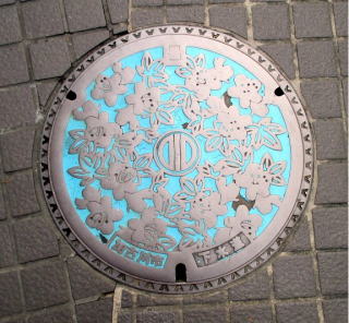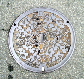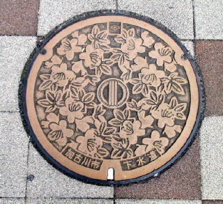 その 8 白地の背景模様の中心に市章を周りに 市の花;ツツジ 周りに市の木;マツ を 描いたデザイン 一般家庭と本管を繋ぐマンホール蓋 撮影日; 2015年7月28日 撮影場所; JR加古川駅南口広場 及び商店街 |