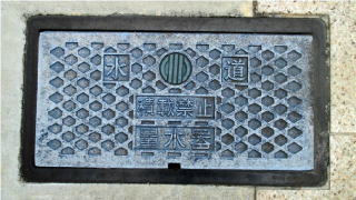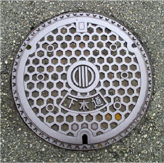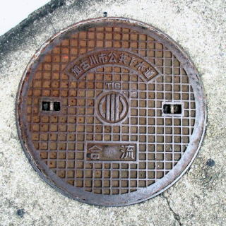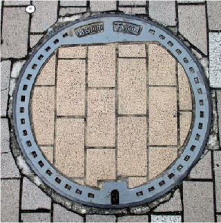 その 5 格子状の背景模様の中心に市章と識別 文字 「合流」 上に管理者名「加古川公共 下水道」 を配したデザイン 撮影日; 2015年7月28日 影場所; JR加古川駅南口広場 及び商店街 |