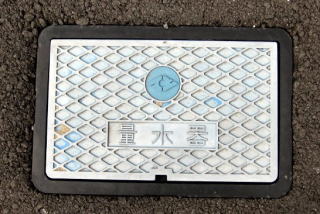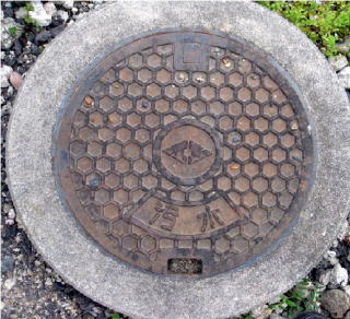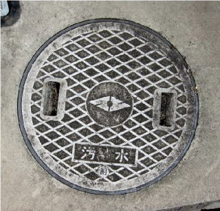 その 5 ひし形の背景模様の中心に町章と識別文字 「汚水」 を配したデザイン 一般家庭と本管を 繋ぐ樹脂製のマンホール蓋 撮影日; 2013年4月4日 撮影場所; JR姫新線 上郡駅前通りの 民家の軒先 |
