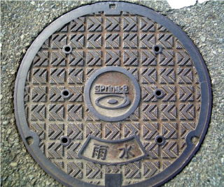 その 2 SPring8(スプリングエイト)Super Photon ring-8 GeVとは播磨科学公園都市にある大型放射光 施設内のマンホール蓋 中心にスプリング8の 表示とロゴマークを配したデザインの雨水専用 蓋 撮影日; 2005年3月4日 撮影場所; 播磨科学公園都市 大型放射光施設内 提供者; 甥のY・H さん |