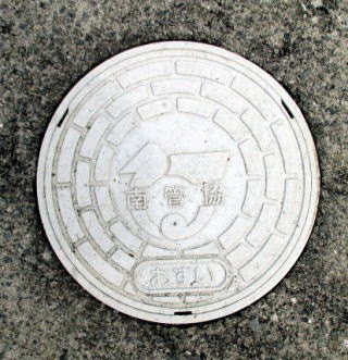 その 8 長方形の同心円状 (4周)の背景模様の 中心に町章と 「南管協」 の文字 「南管協」 とは旧南光町の下水道の配管 製作 施工の協同組合の略称か? 珍しい表示 撮影日; 2018年7月28日 撮影場所; JR姫新線 徳久駅前の 県道368号沿いの民家の軒先 |