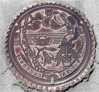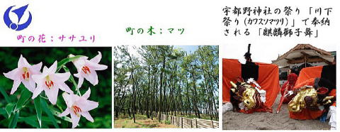 その 1 日本海を背景に 町の木;マツ 町の花; ササユリ 町の名産;カニ をそして川下 (カワスソ)祭の麒麟獅子舞の獅子の面を 描いたデザイン 撮影日; 2015年4月22日 撮影場所; 浜坂高校横の 県道127号沿い