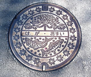 その 1 中心に管理者名 「はが」 と識別文字 「お すい」 を上に 町の花;キク 下左 「アマゴ」 右下 「ヤマメ」 を周りに 町の花;カエデ の 葉を配したデザイン 撮影日; 2007年2月12日 撮影場所;道の駅 はが 付近 提供者; 甥のY・H さん