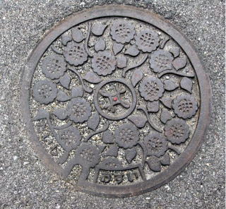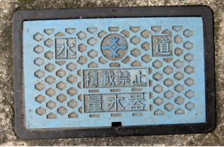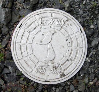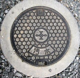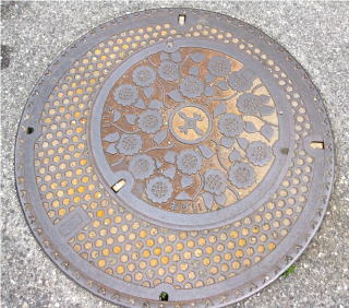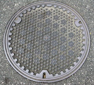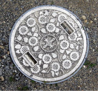 その 3 その 1 と同じデザインの樹脂製の一般 家庭と本管を繋ぐマンホール蓋 撮影日; 2013年4月4日 撮影場所; JR網干駅北口 県道27号沿いの民家 |