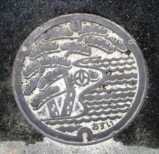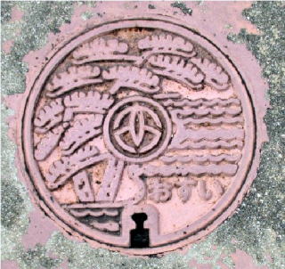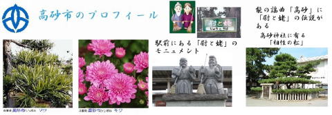 その 1 白砂の海岸に一つの株から雌雄の幹が 左右に別れた松 「相性の松」 を描いた デザイン 高砂市には室町時代に作られた 「能」 の 謡曲 「高砂」 にまつわる 「尉と姥(ジョウと ウバ)」 の伝説がある 撮影日; 2015年7月28日 撮影場所; JR宝殿駅前通り |