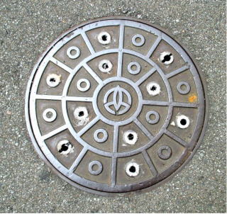 その 3 同心円状に 〇 を配した背景模様の 中心に市章を配したデザイン 撮影日; 2015年7月28日 撮影場所; JR宝殿駅前通り |