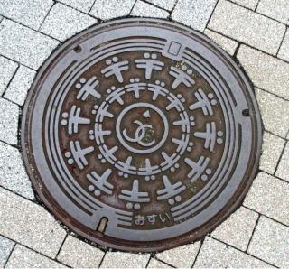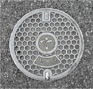 その 4 長方形を同心円状に (四重) 描いた背景 模様の中心に市章を下に識別文字 「おす い」 を配したデザイン 一般家庭と本管を繋ぐ鉄製のマンホール蓋 撮影日; 2015年7月28日 撮影場所; JR姫新線 本竜野駅前通り 県道14号沿いの民家 |