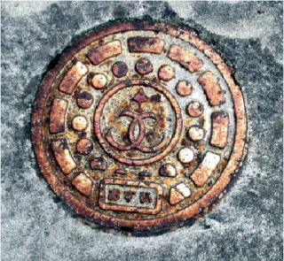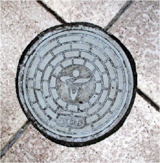 その 3 長方形を同心円状に(五重)描いた背景 模様の中心に市章を下に識別文字 「お すい」 配したデザイン 一般家庭と本管を繋ぐ鉄製のマンホール蓋 撮影日; 2015年7月28日 撮影場所; JR姫新線 本竜野駅前通り 県道14号沿いの民家 |