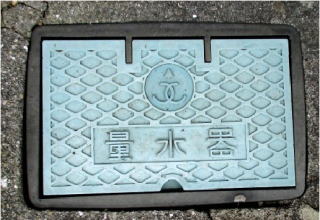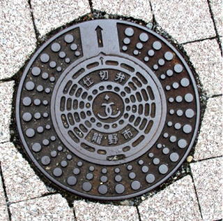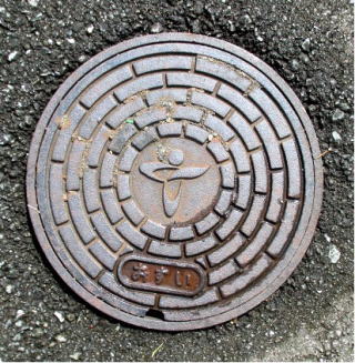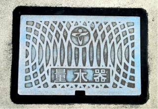 その 6 市章を上に配した水道の量水器蓋 撮影日; 2015年7月28日 撮影場所; JR姫新線 本竜野駅前通り 県道14号沿いの民家 |