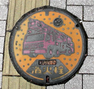 その 5 市章上に配し 消防車を描いたデザインの 消火栓蓋 撮影日; 2015年7月28日 撮影場所; JR姫新線 本竜野駅前通り 県道14号沿い |