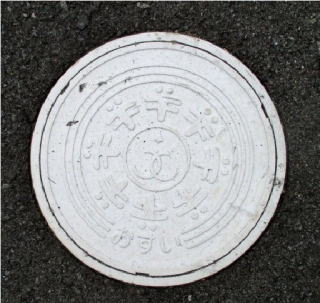 その 2 中心に市章を周りにトンボを一重に描き、 下に識別文字 「おすい」 を配したデザイン 一般家庭と本管を繋ぐ樹脂製の蓋 撮影日; 2015年7月28日 撮影場所; JR姫新線 本竜野駅前通り 県道14号沿いの民家 |