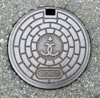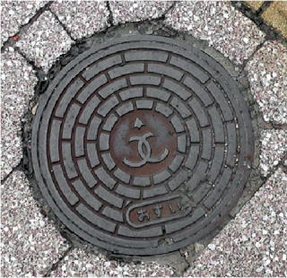 その 5 中心に市章を周りに●と長方形を配した デザイン 一般家庭と本管を繋ぐ鉄製のマンホール蓋 撮影日; 2015年7月28日 撮影場所; JR姫新線 本竜野駅前通り 県道14号沿いの民家 |