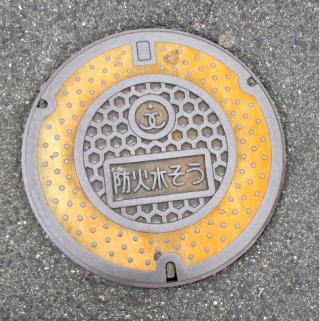 その 6 六角形の背景模様に市章と識別文字 「防火 水そう」 を配したデザインの防火水槽の蓋 撮影日; 2015年7月28日 撮影場所; JR姫新線 本竜野駅前通り 県道14号沿い |