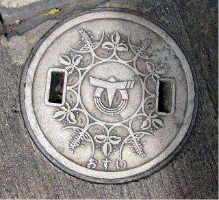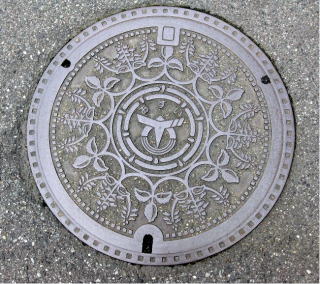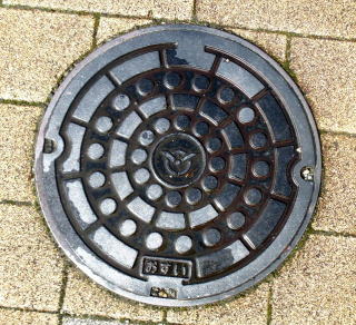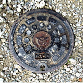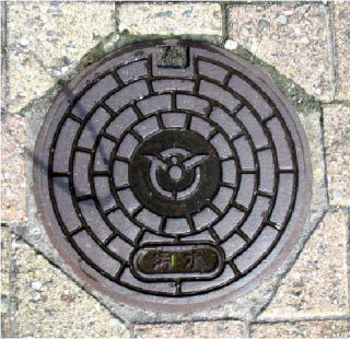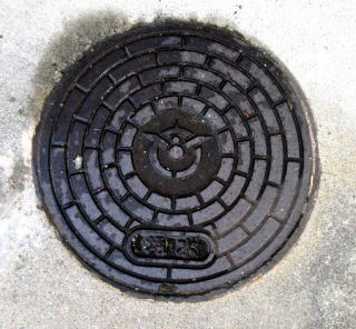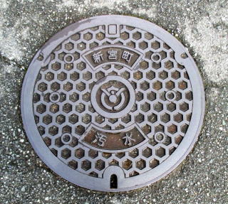 その 1 六角形の背景模様の中心に市章を上に 管理者名 「新宮町」 下に識別文字 「汚 水」 を配したデザイン 撮影日; 2015年7月28日 撮影場所; JR姫新線 播磨新宮駅 駅前広場 駅前通り |