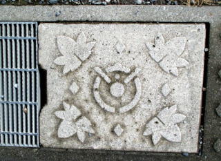 その 7 中心に町章を周りに 町の木; カエデ を 描いたコンクリートの側溝蓋 撮影日; 2015年7月28日 撮影場所; JR姫新線 播磨新宮駅 駅前広場 駅前通り |
