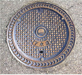その 1 小さな四角と八角形の背景模様の 中心に町章と識別文字 「下水道」 を配したデザイン 撮影日; 2009年6月17日 撮影場所; 丸金醤油記念館付近 K-28号沿い