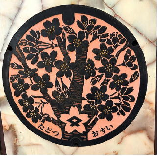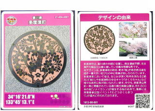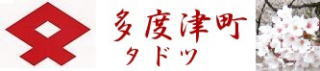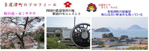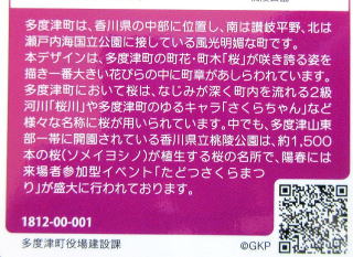 その 2 桜の花の色をイメージしたピンク色の背景 模様に 町の花・木;サクラ の大木と咲く花 を そして幹の中に町章を描いたデザイン 下に管理者名 「たどつ」 と識別文字 「おすい」を配したカラー版 撮影日; 2018年12月25日 撮影場所; 多度津町庁舎内 提供者; 妻のS・S