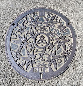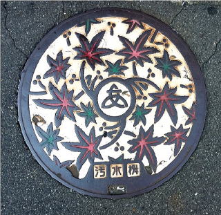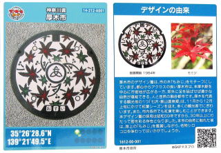 その 3 薄紅色の背景色に 市の木;モミジ を蓋全体 に描き 中心に市章を識別文字「汚水桝」を 配したデザインのカラー版 識別文字「桝」の表示は珍しい 撮影日; 2018年7月20日 撮影場所; 小田急小田原線「本厚木駅」 駅前広場 提供者; 甥の Y・H さん