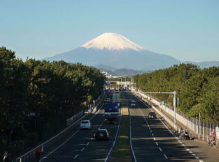 の並木沿いにと富士山を正面に見る