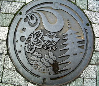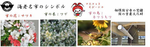 その 2 中心に市章を周りに相模国分寺の 七重の塔 市の花;サツキ 市の木; ツゲ 描き 更にその周りに相模川 の波や波立泡をイメージしたものだ そうです 撮影日; 2008年5月18日 撮影場所; 小田急「海老名駅」 東口付近 提供者; 甥のY・H さん